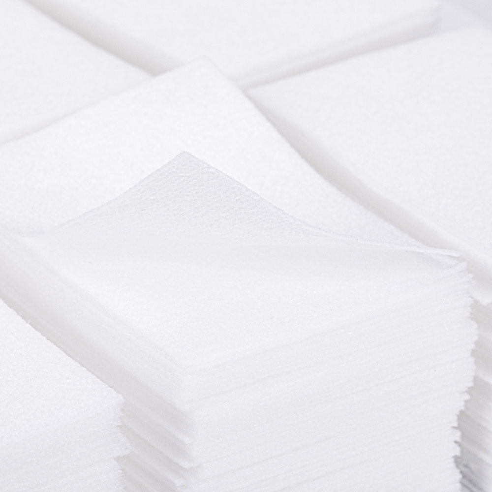 Cotons rectangulaires non pelucheux, spécialement conçus pour les soins esthétiques et le stylisme ongulaire. Leur structure en 12 plis garantit une excellente absorption sans laisser de résidus.