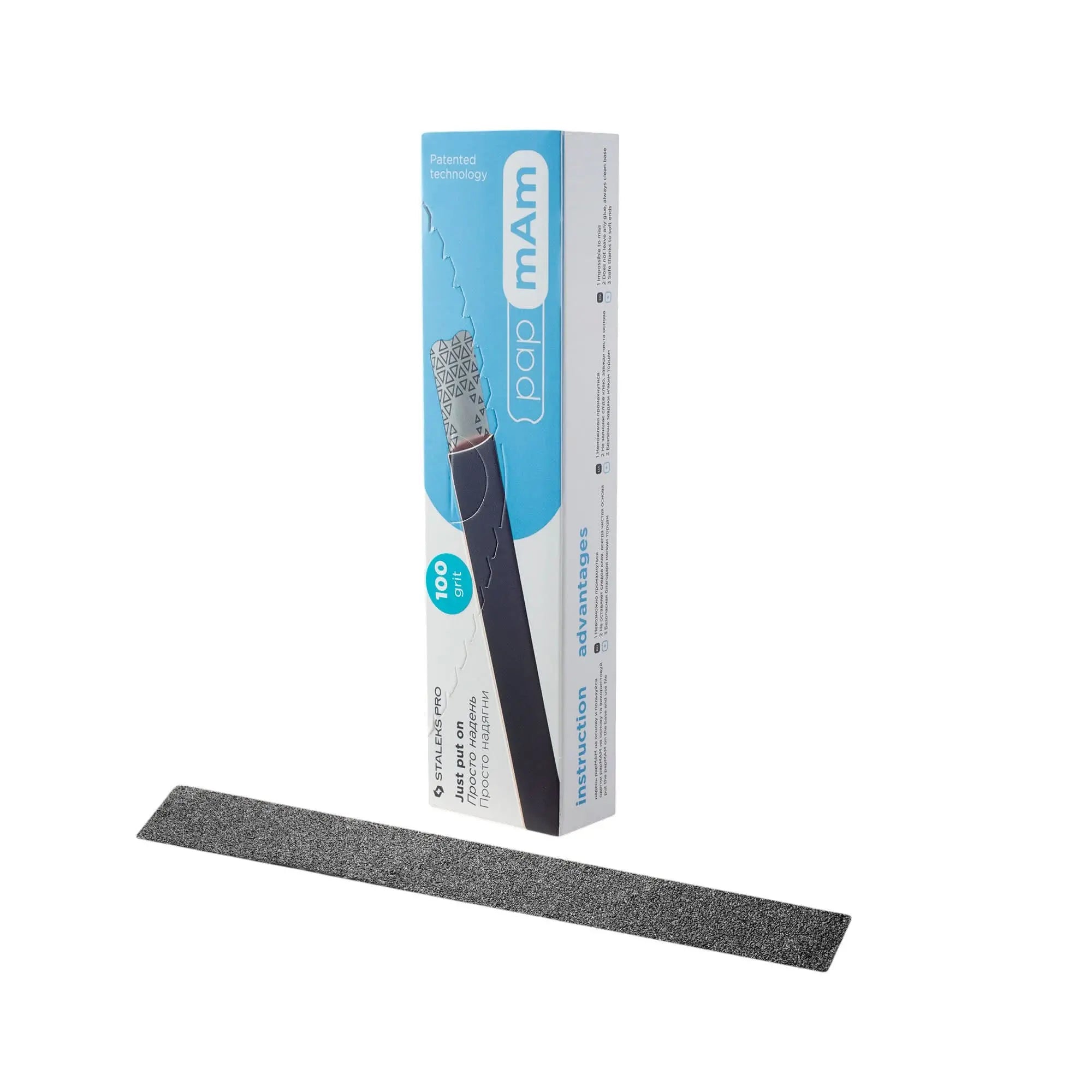 La technologie papmAm, développée et brevetée par Staleks, révolutionne l'utilisation des limes à ongles. Le revêtement abrasif se place sur la base comme un couvercle, recouvrant entièrement ses deux faces.